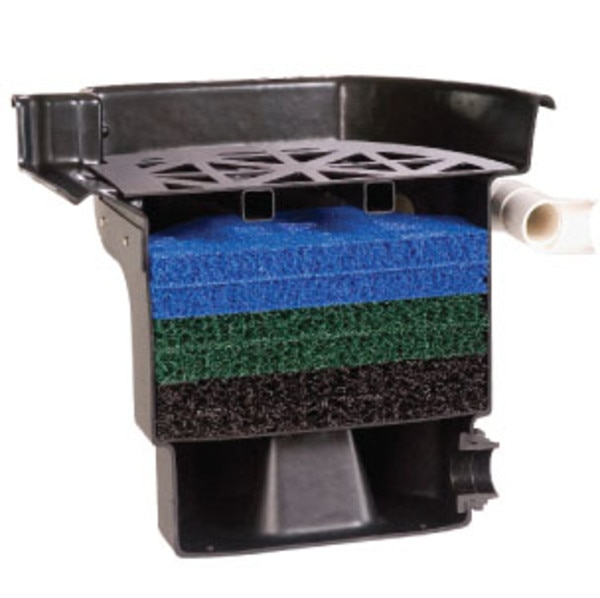 Biomechanical filters remove suspended solids, convert toxic ammonia and nitrites to harmless nitrates and aerate the pond