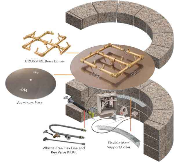 - Includes - Crossfire burner, electronic ignition control system, appropriate flex line kit, flat plate, support collars and aluminum cover