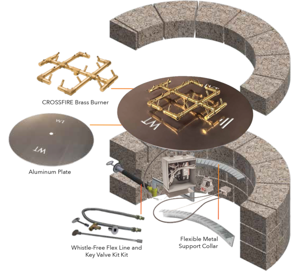 - Includes - Crossfire burner, electronic ignition control system, appropriate flex line kit, flat plate, support collars and aluminum cover