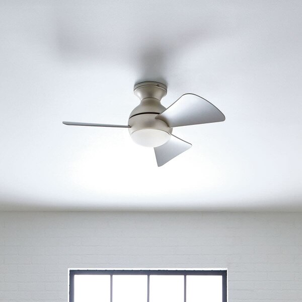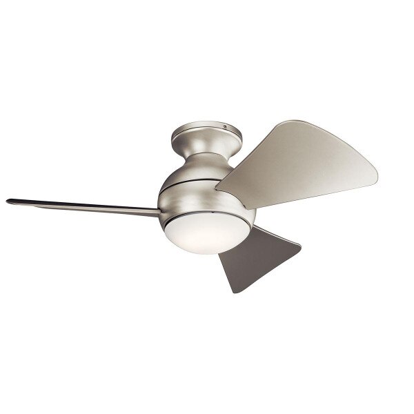 This Brushed Nickel 34 inch ceiling fan from the Sola collection which can be used in wet locations, features integrated LED lighting and flush mount installation. The globe inspired motor housing shape brings delightful style to any space. A metal fixture cap is included for non light use installations.